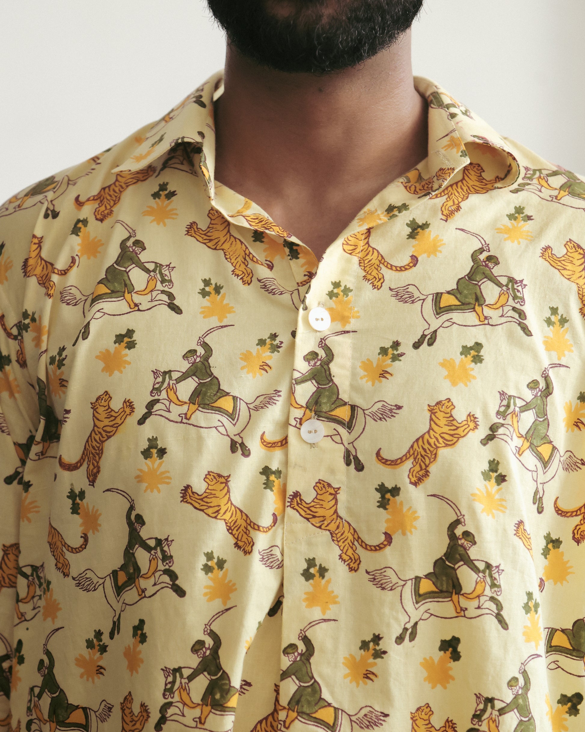 A fierce tale unfolds on cotton—the age-old depiction of man against beast. A rider on horseback locked in combat with a ferocious tiger, captured through hand block printing, gives this farmer’s shirt its raw power. It stands as a reminder of timeless courage, carried forward through craft and cloth.