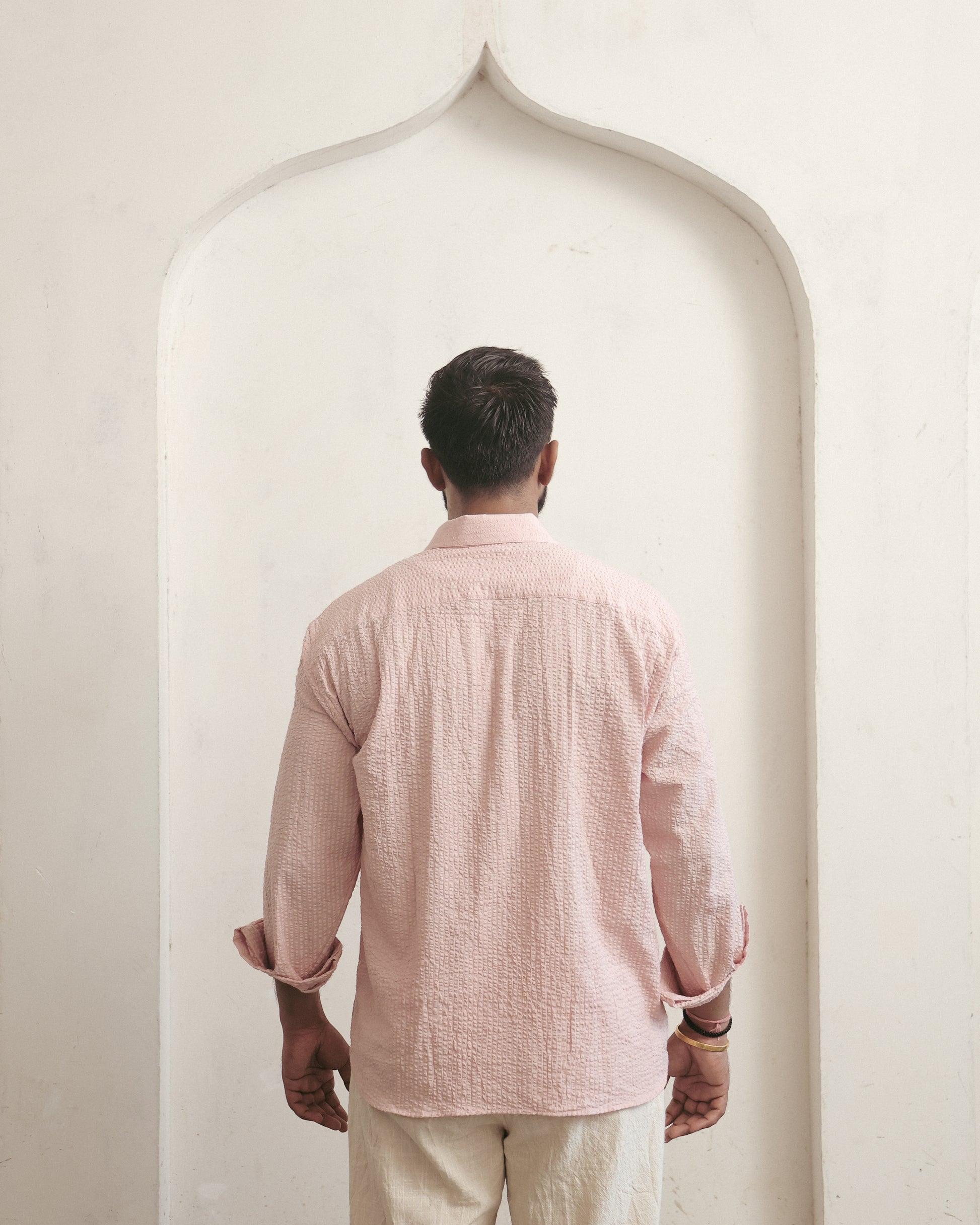 Crafted in seer sucker—a word taken from the Hindi sheer (milk) and shakkar (sugar)—this shirt tells the story of a mulakaat, a meeting that lingers in memory. Hand block–printed motifs, transformed into sticker-like patches, bring a modern, funky twist to timeless craft. A playful blend of sweetness and tradition, made for moments that feel like first encounters.