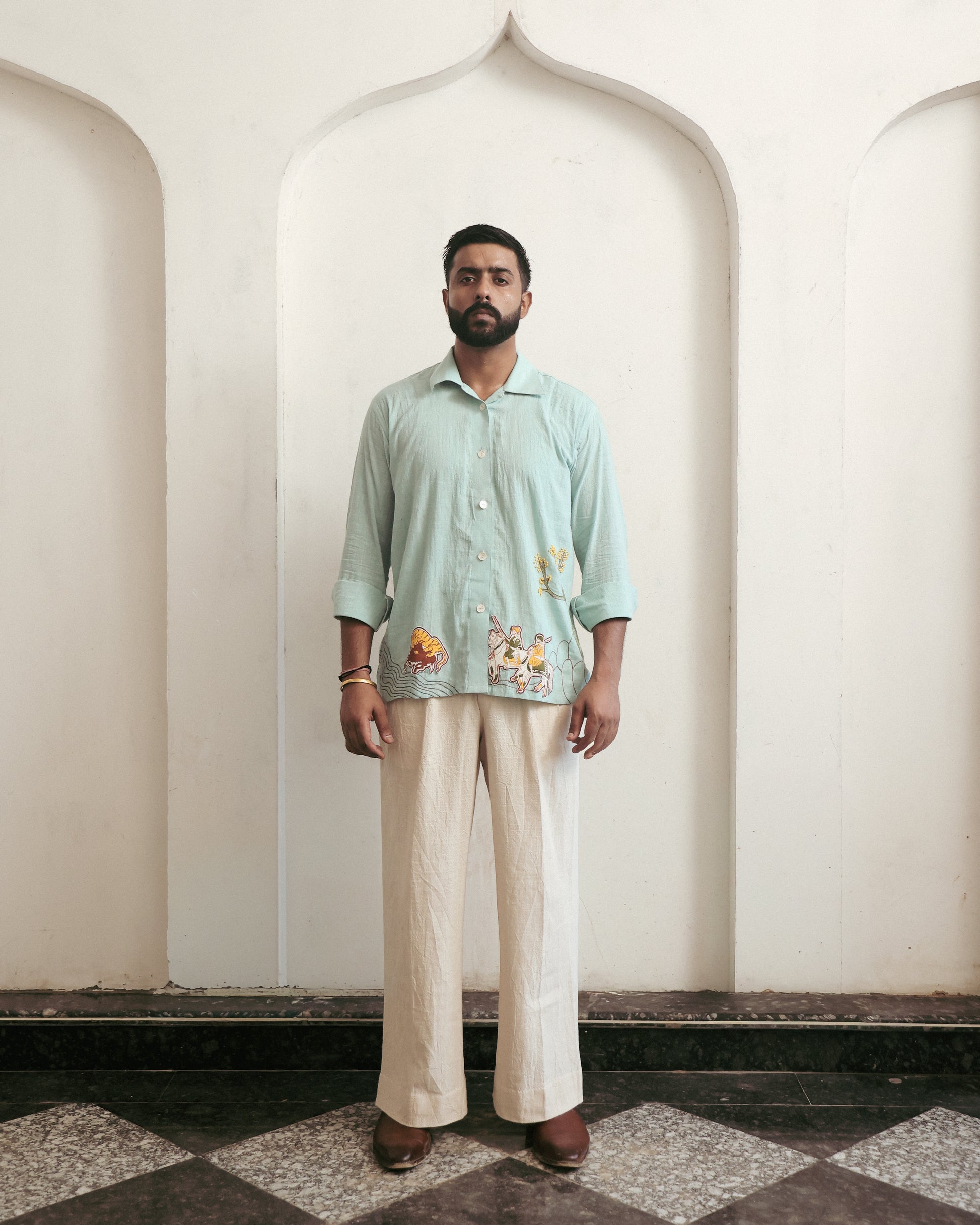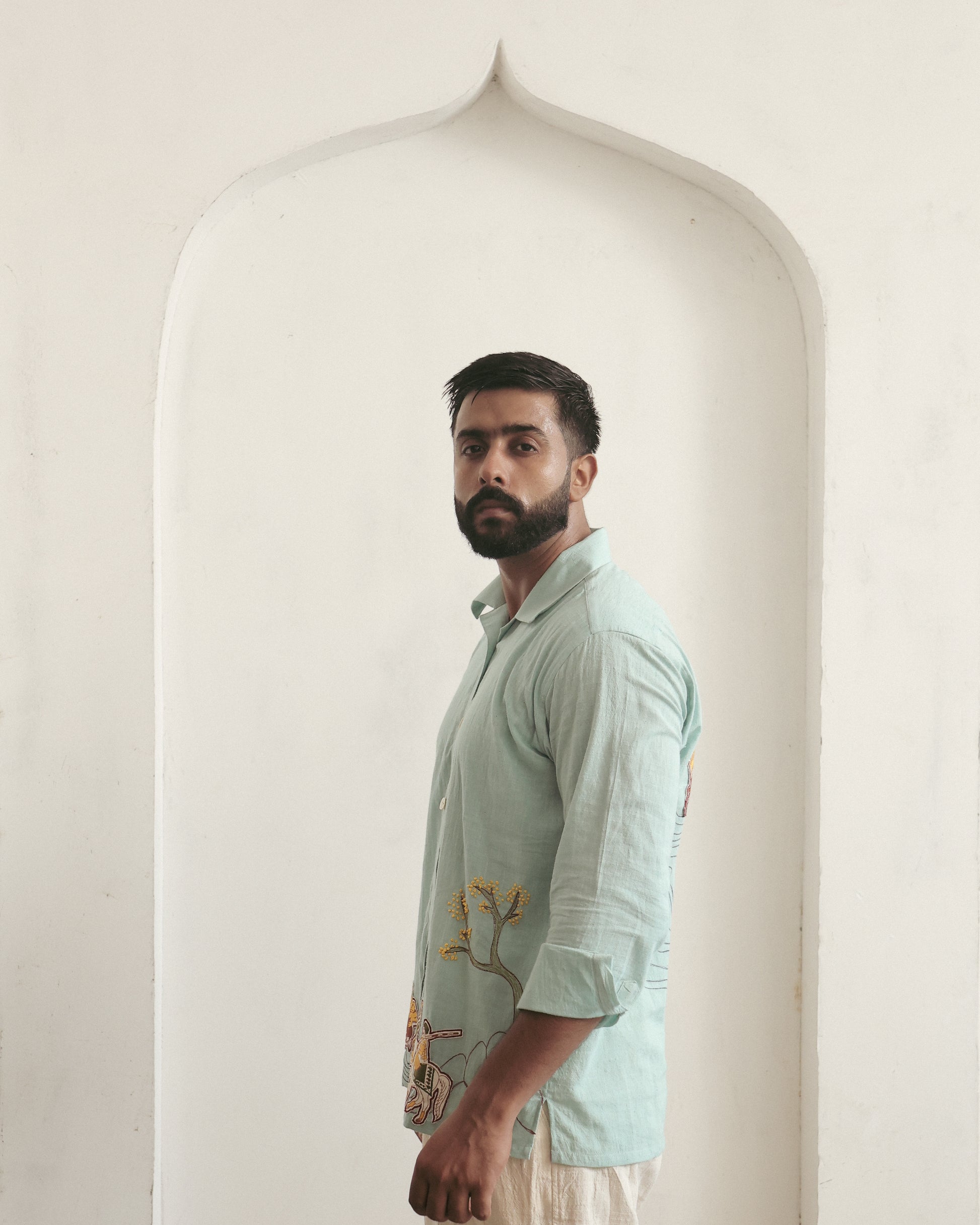 Inspired by the vast hunting grounds of old, this shirt unfolds a scene of two men chasing across rocky hills, with a river winding through and animals in motion. Embroidery lays the landscape, while hand block printing brings the finer details to life. A meeting of rugged spirit and delicate craft, it carries the essence of adventure woven into tradition.
