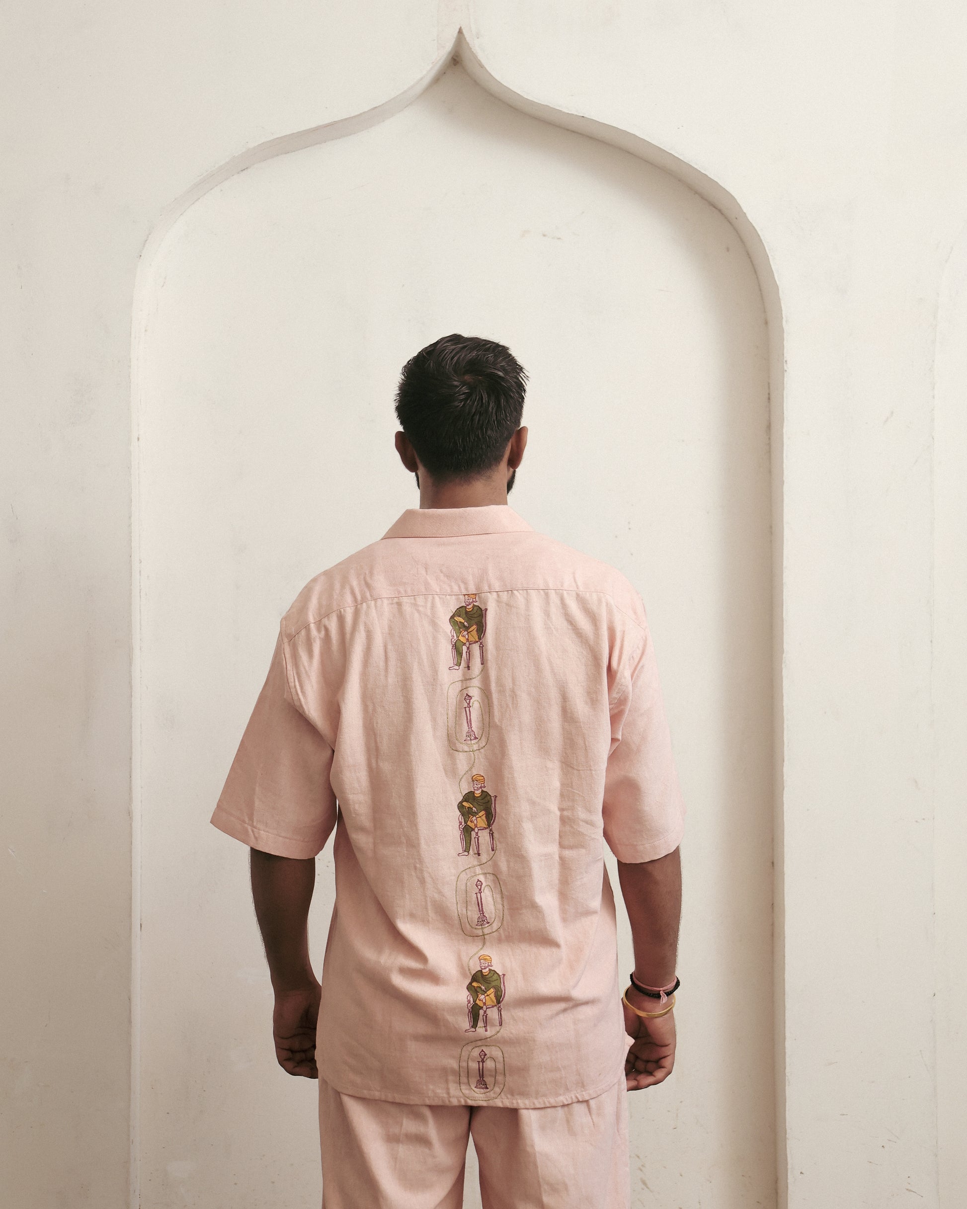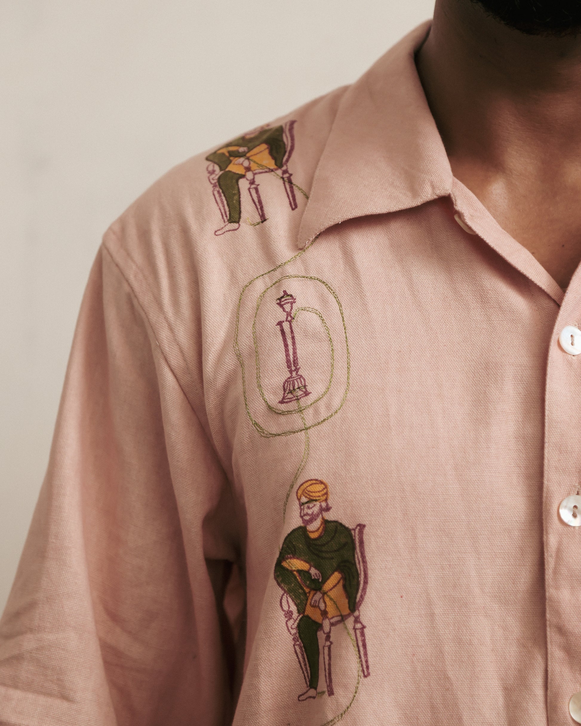 A portrait of ease, this co-ord set captures a man lounging on a chair with his hookah, the smoke drifting into patterned forms. Crafted with hand block printing and finished with embroidery, the scene turns everyday leisure into art. A celebration of stillness and style, it carries the simple luxury of sukoon.